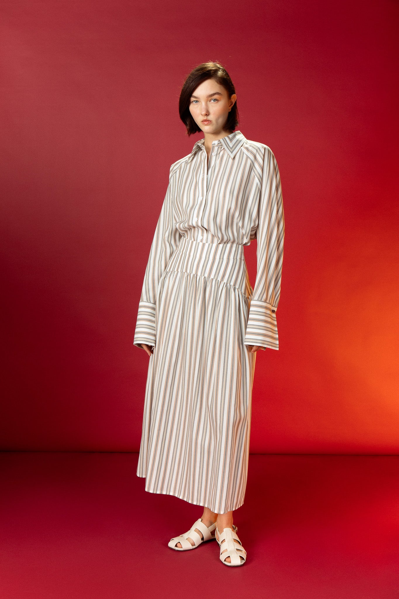 Gathered skirt with half-moon yoke. Back invisible zipper.