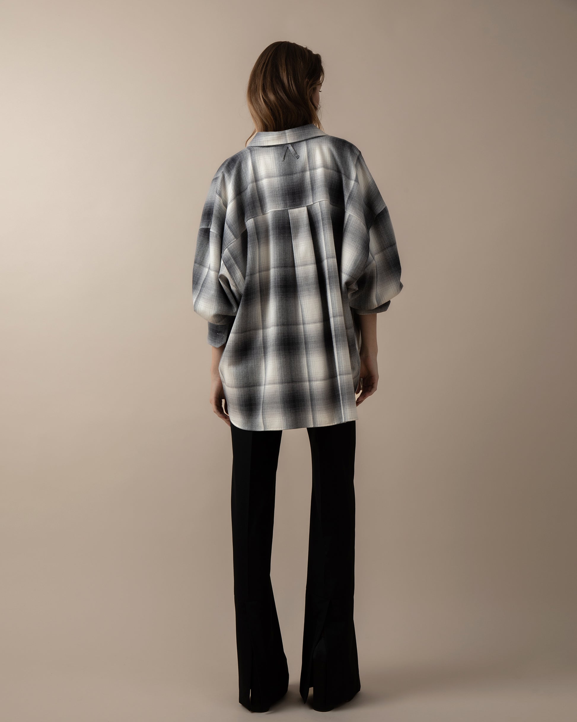 Lined overshirt with oversized fit. Pointed collar and buttoned front-fastening. Two chest patch pockets with detailed stitching as A-design. Dropped shoulder with back yoke and box pleat. Loops on the back of the collar as the A-design. Round bottom hem.