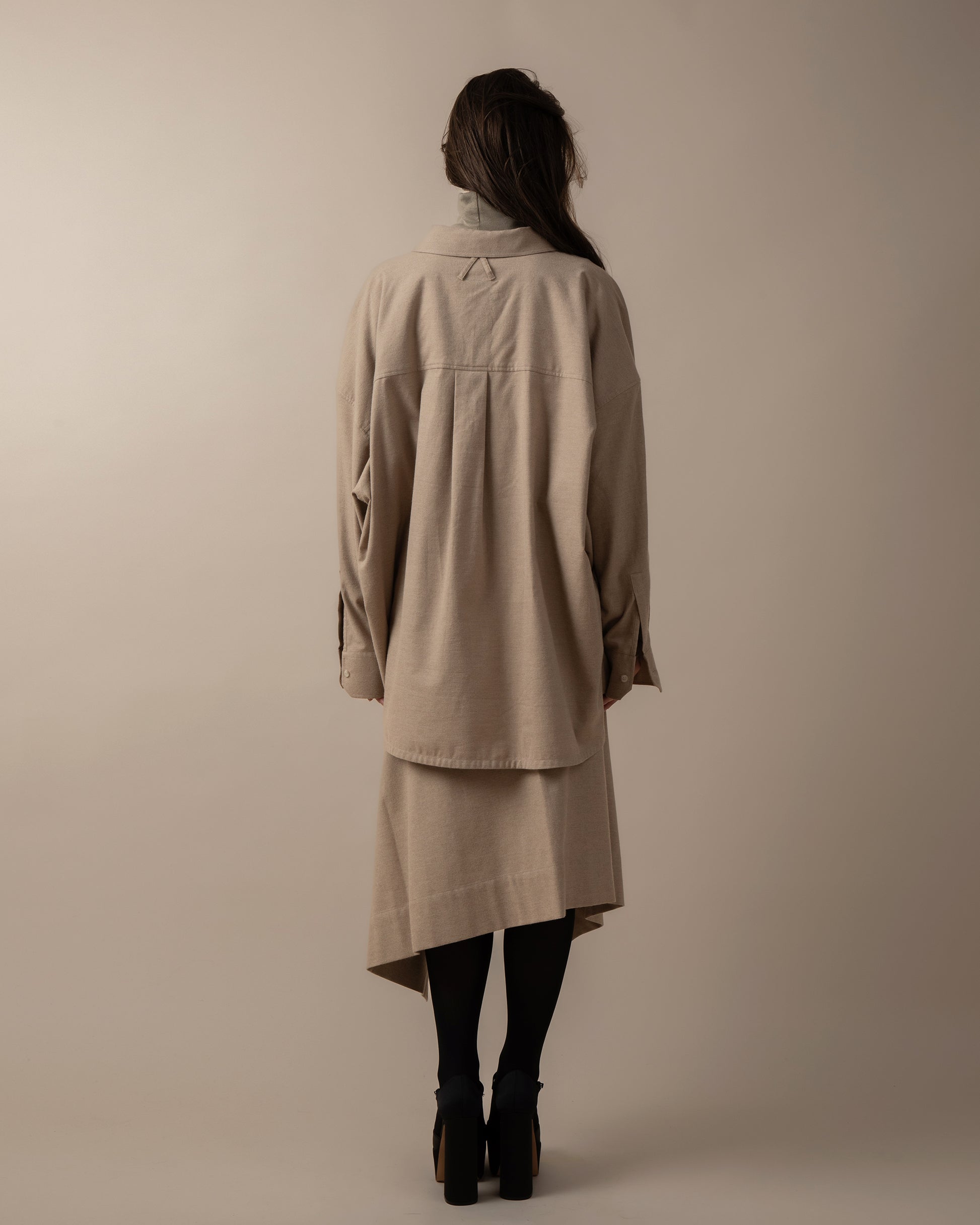 Oversize-fit shirt with pointed collar and front fastening hidden buttons. Two patch chest pockets with stitching A-design detail. Longsleeve with double pleated detail cuff and single button fastening. Back yoke with center box pleat. Loops on the back as the A-design. Round bottom hem.