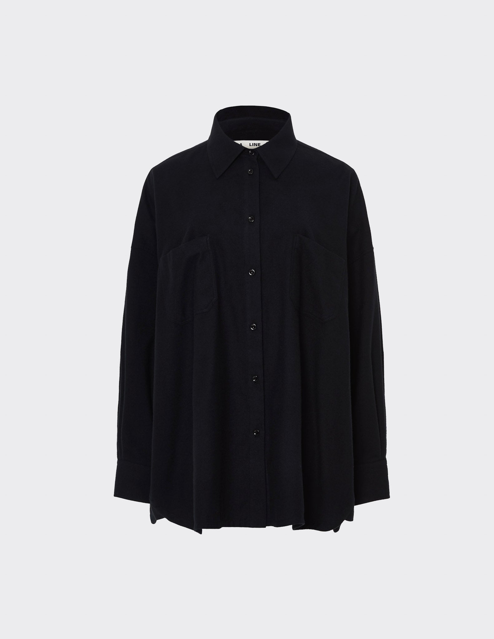 Oversize-fit shirt with pointed collar and front fastening hidden buttons. Two patch chest pockets with stitching A-design detail. Longsleeve with double pleated detail cuff and single button fastening. Back yoke with center box pleat. Loops on the back as the A-design. Round bottom hem.