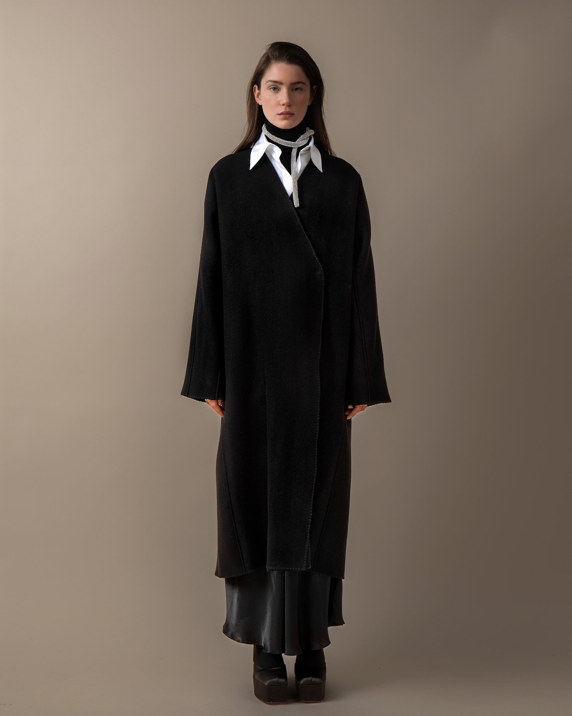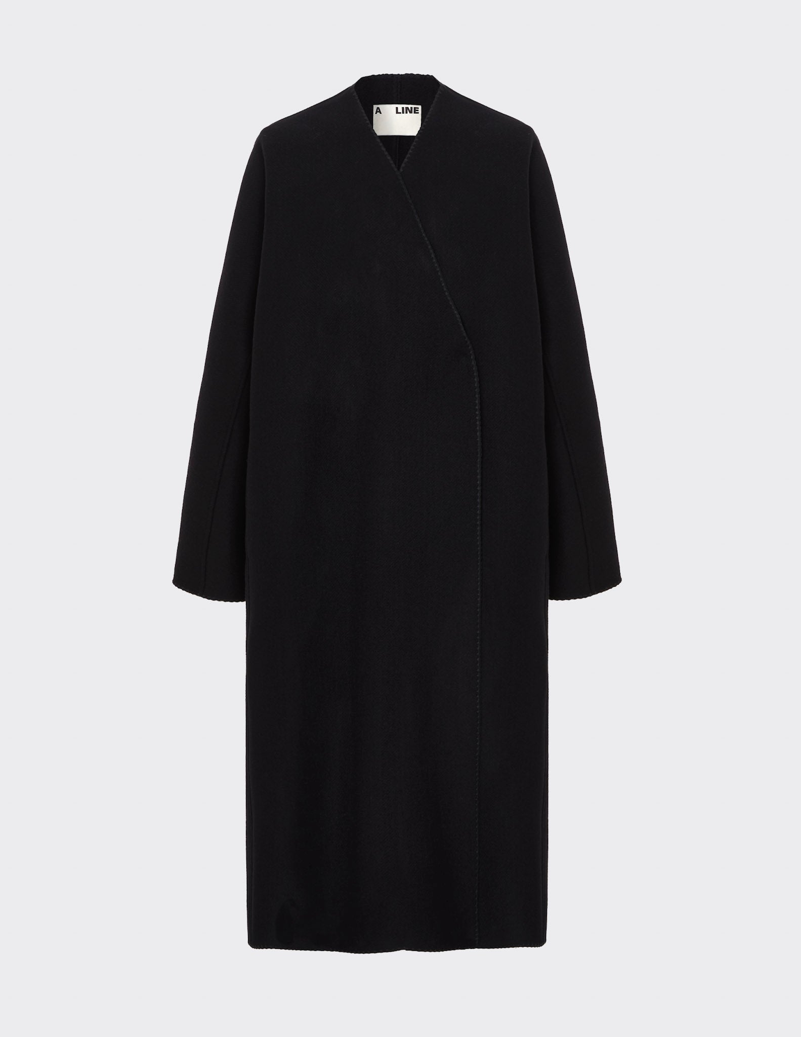 Oversized coat with raglan sleeves. Midi lenght with cocoon silhouette. Collarless with detailed stitching and embroidered hems. Hidden snap buttons. Unlined.