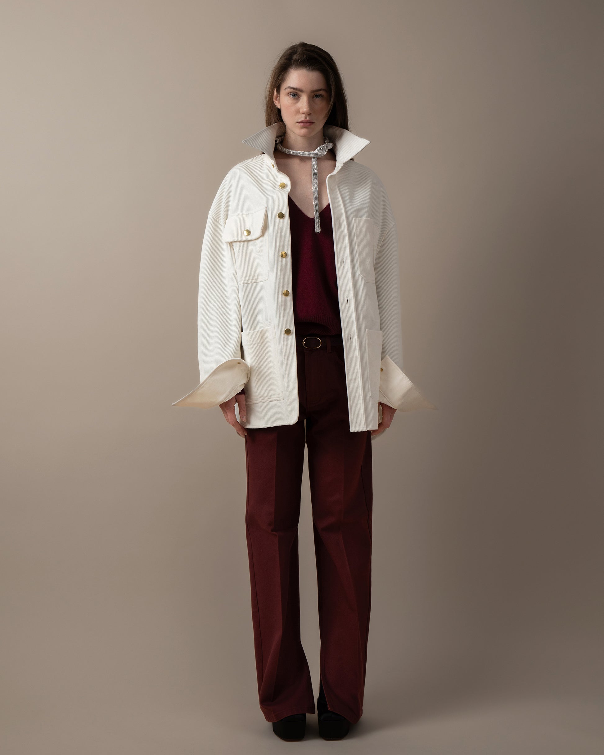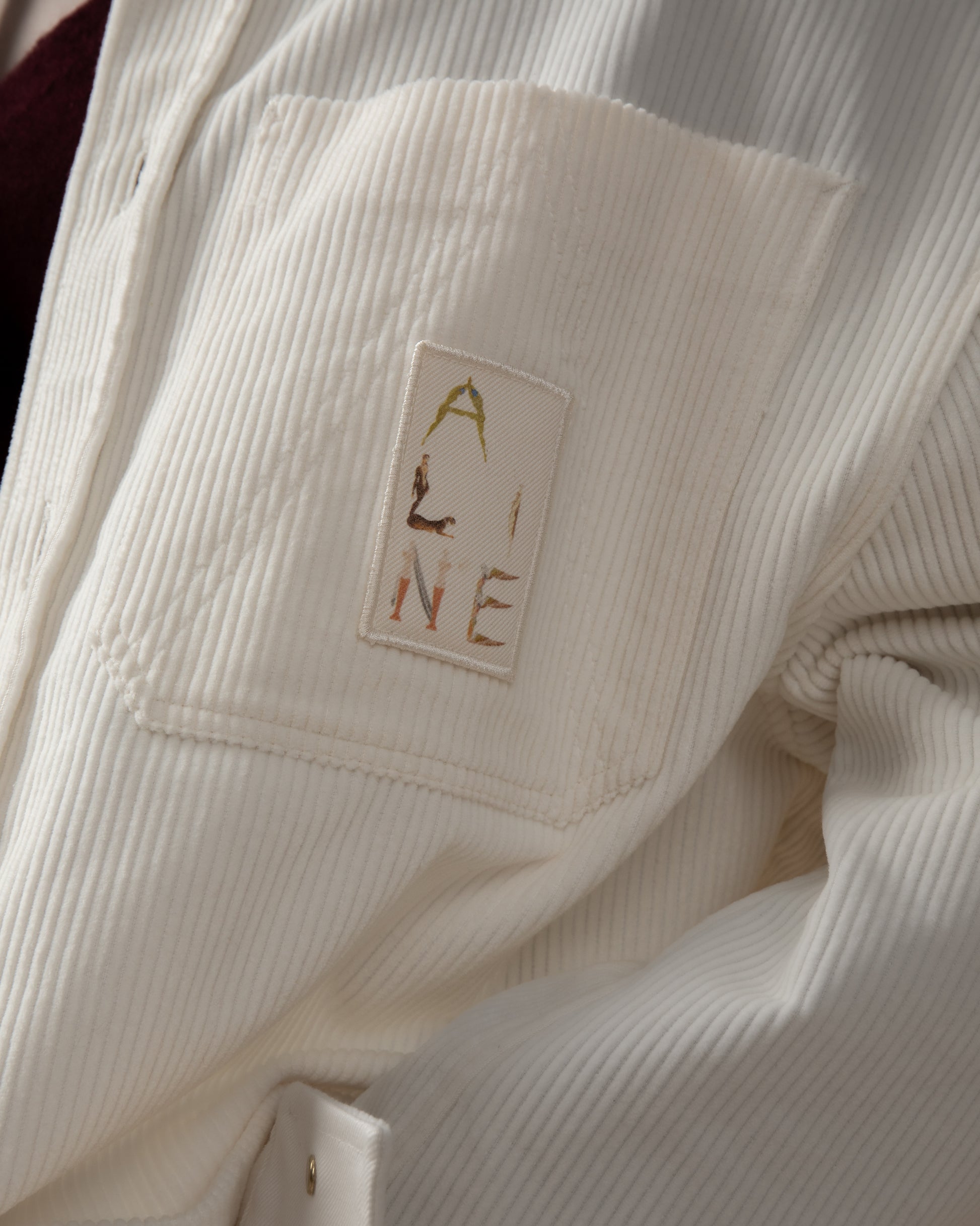 Relaxed fit corduroy utility jacket with boxy silhouette. Contrast fabric pointed collar, 1 chest patch pocket, 1 patch pocket with flap and 2 patch pockets on the front, all with double stitiching detail in A design. Long-sleeve with contrast fabric cuffs. Raglan sleeves. Center back seam with belt lops as the A-detail on the back of the collar. Round bottom hem.