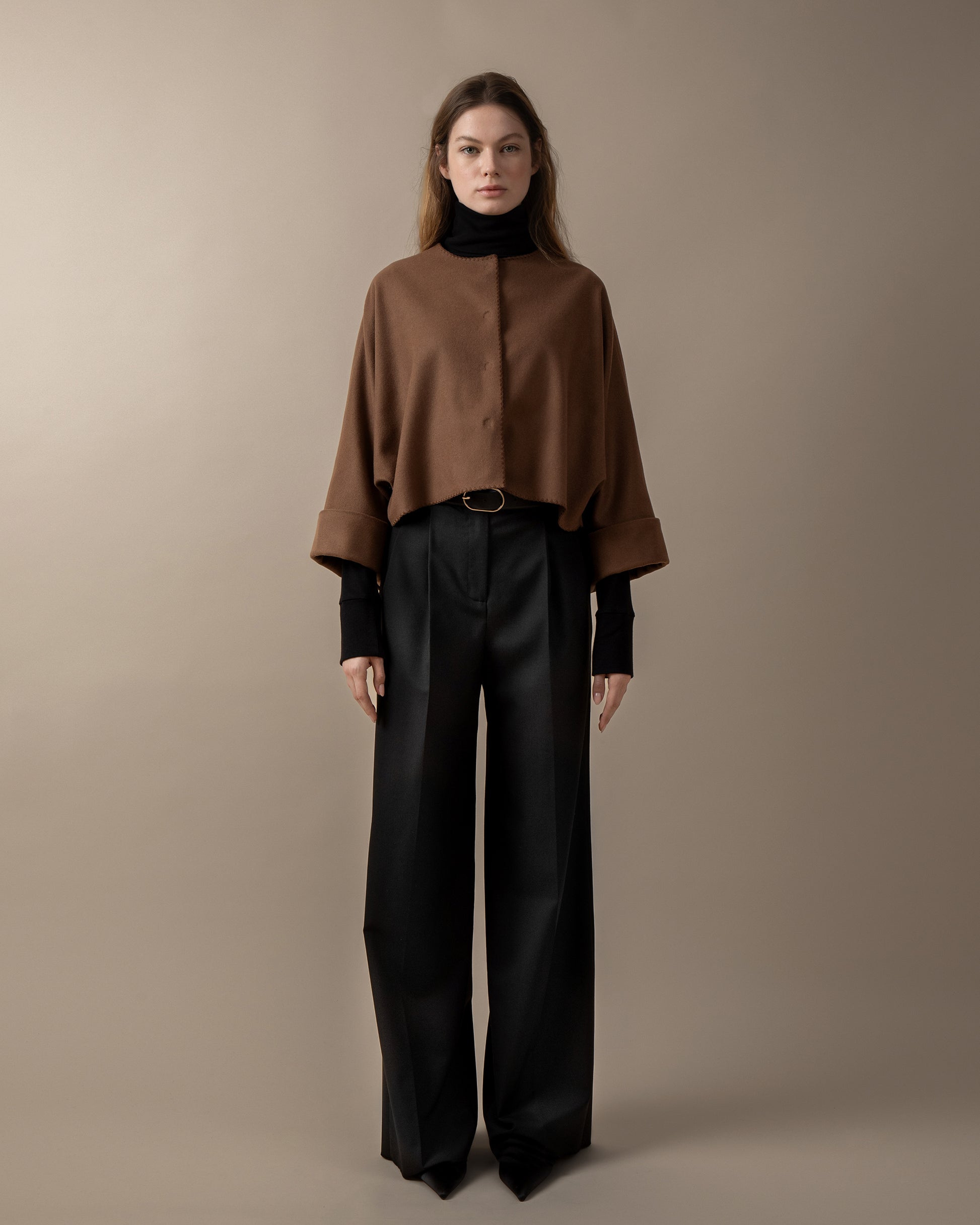 Collarless oversized cropped wool jacket with bat-like sleves and accentuated large buttonless cuffs. Hidden snap buttons. Embroidered hems. belt lops as the A-detail on the back of the collar.