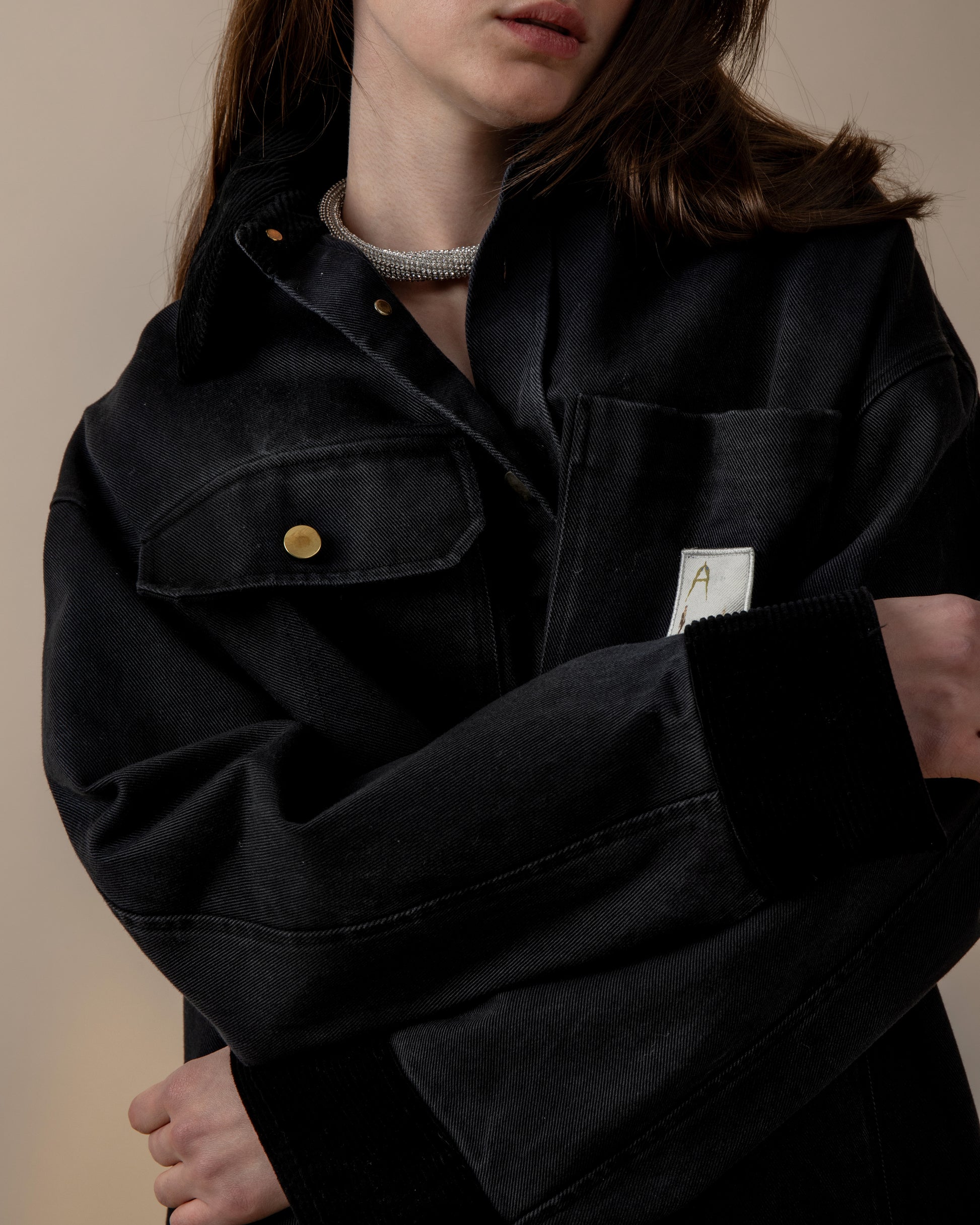 Relaxed fit denim utility jacket with boxy silhouette. Contrast corduroy pointed collar, 1 chest patch pocket, 1 patch pocket with flap and 2 patch pockets on the front, all with double stitiching detail in A design. Long-sleeve with contrast fabric cuffs. Raglan sleeves. Center back seam with belt lops as the A-detail on the back of the collar. Round bottom hem.