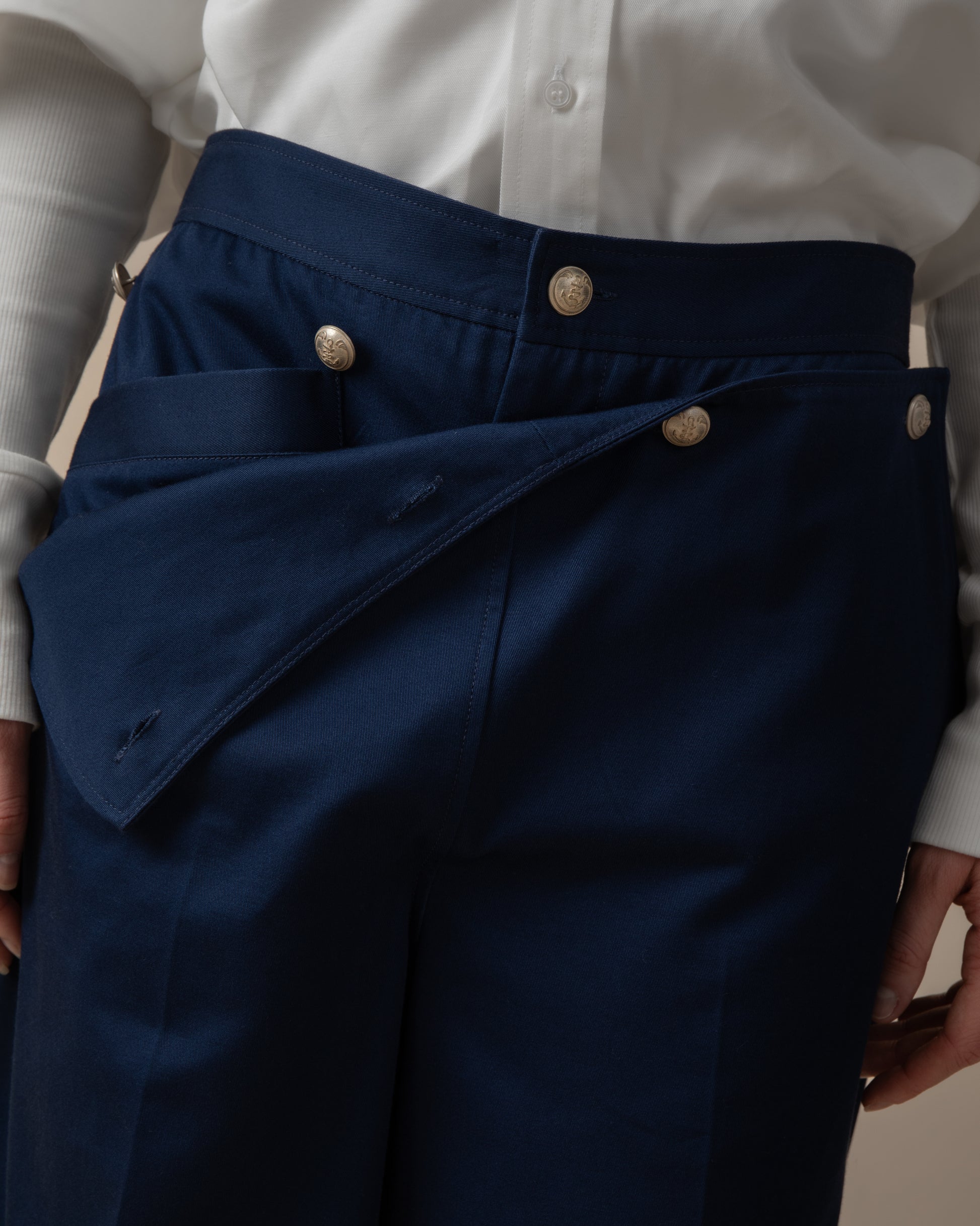 Relaxed fit trousers with front-panel and buttons detailing. Creased leg with front patch pockets and two rear patch pocket with A -detailing in double stitching. Corset detail on the back. Belt loops on the back with A-design.