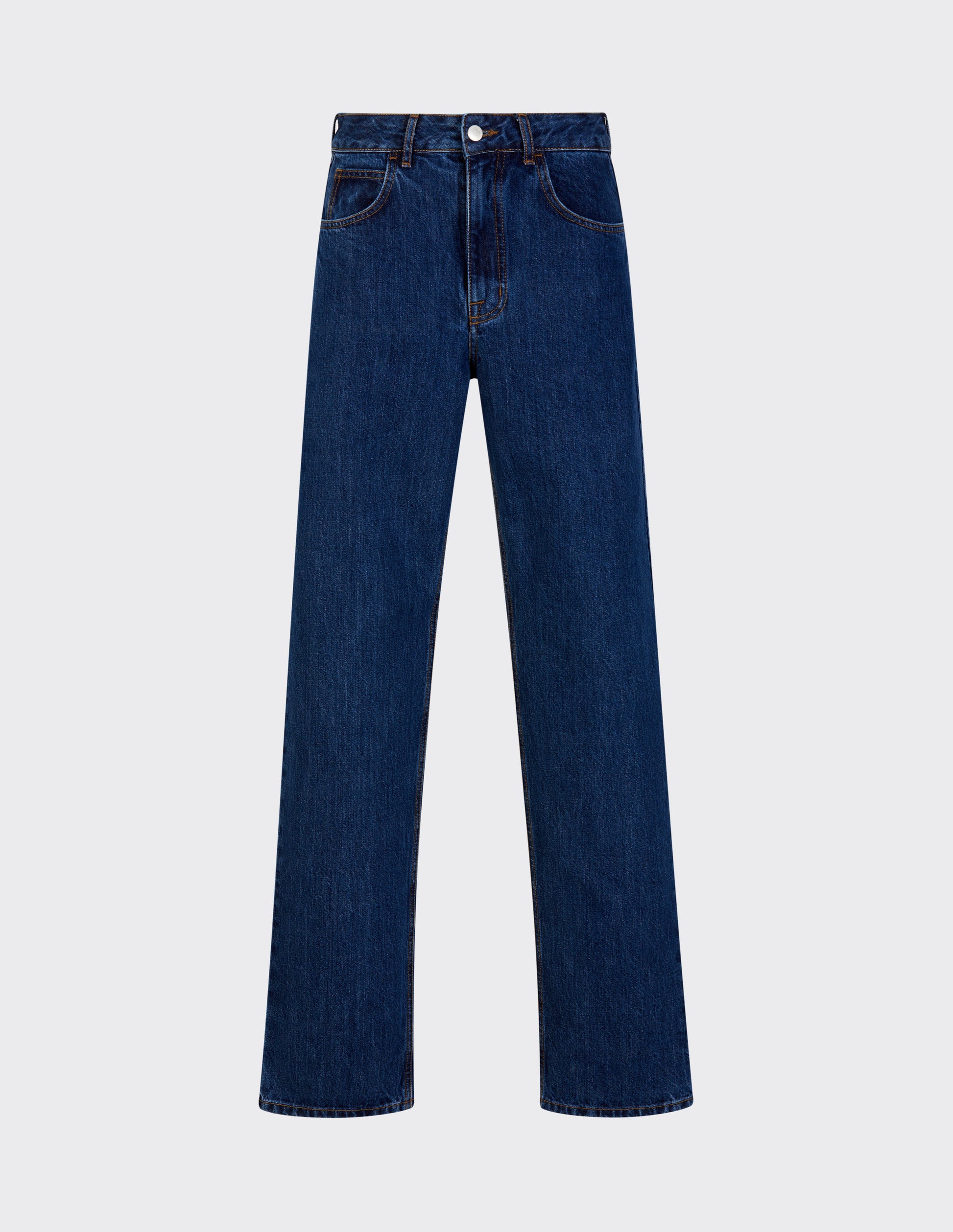 Mid-rise straight-leg organic cotton jeans with contrast stitching. Dropped flare waist-style, regular fit with 4 pocket and 1 coin pocket. Light wash denim. Single button waistband front fastening and zipper. Interior front pocket lining with contrasting cotton fabric. Bottom hem-detailing.