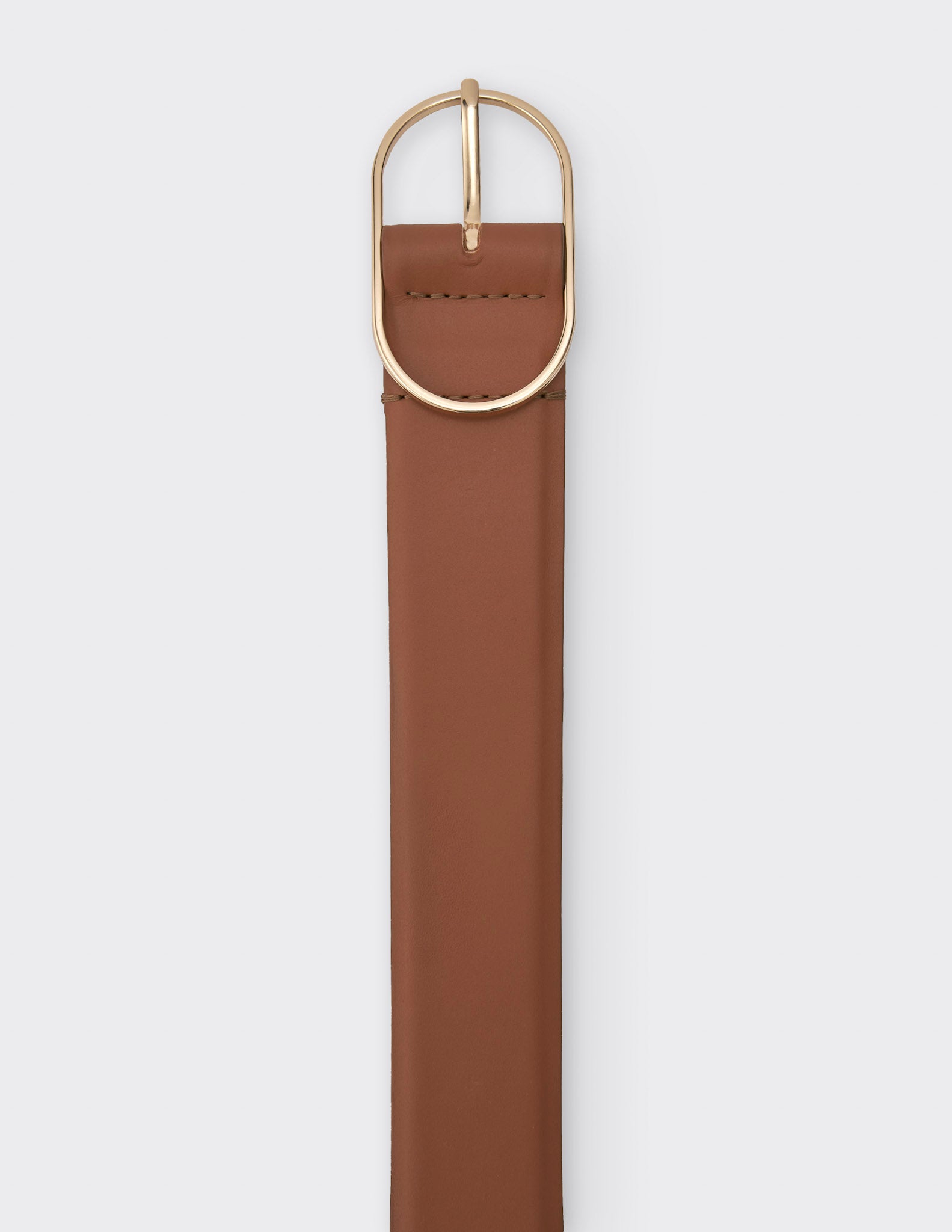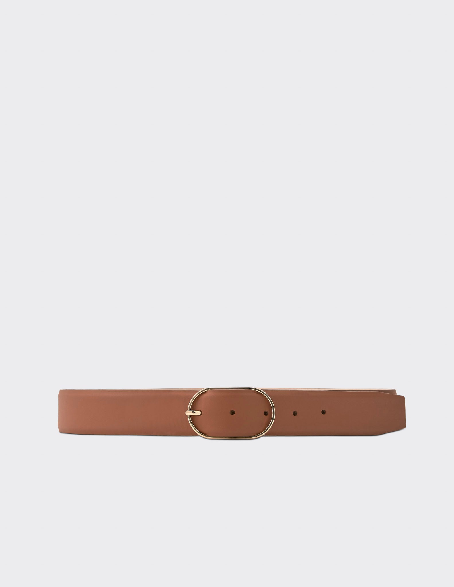 Large leather belt with a classic silhouette and gold metal buckle fastening.