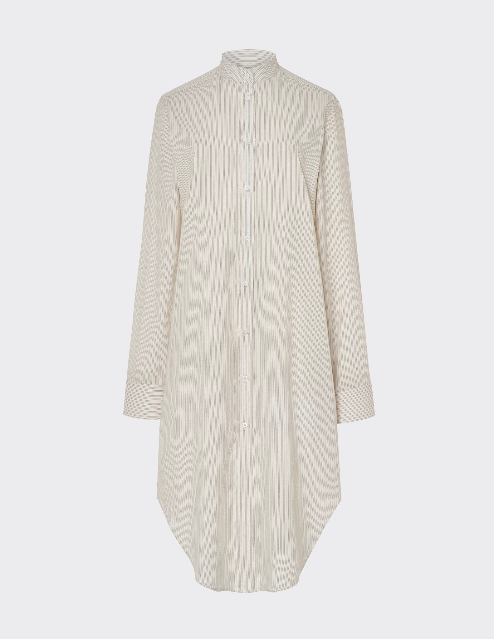 Mandarim-collar buttoned front-fastening overshirt. Relaxed-fit with dropped shoulder. Double-pleat black yoke with loops on the back as the A-design. Longsleeve with accentuated opening cuff.