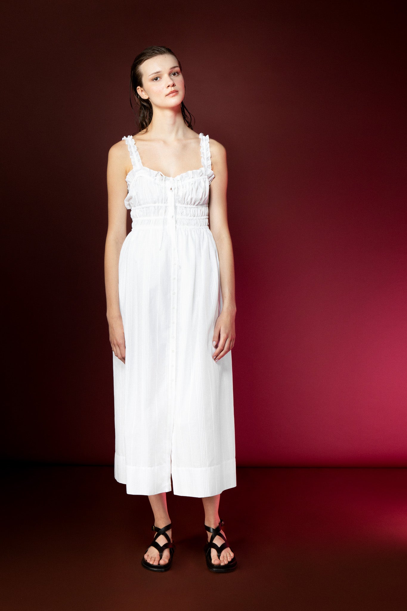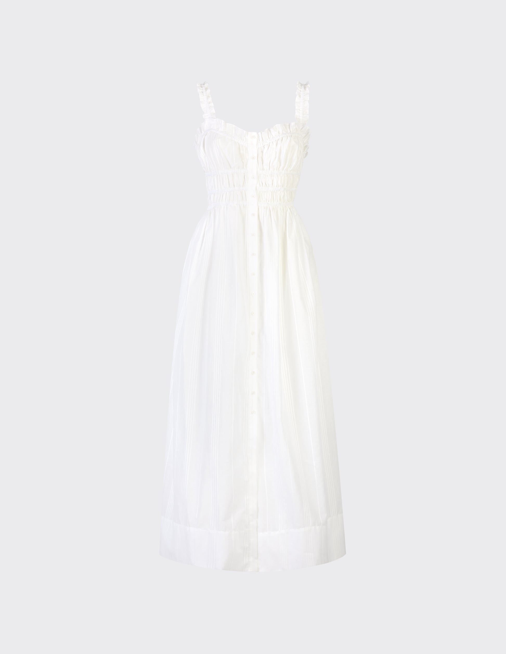 Semi-circular, midi length sundress with button-down detail. Elastic gathered corset style top with ruffled straps. Optional lining available.