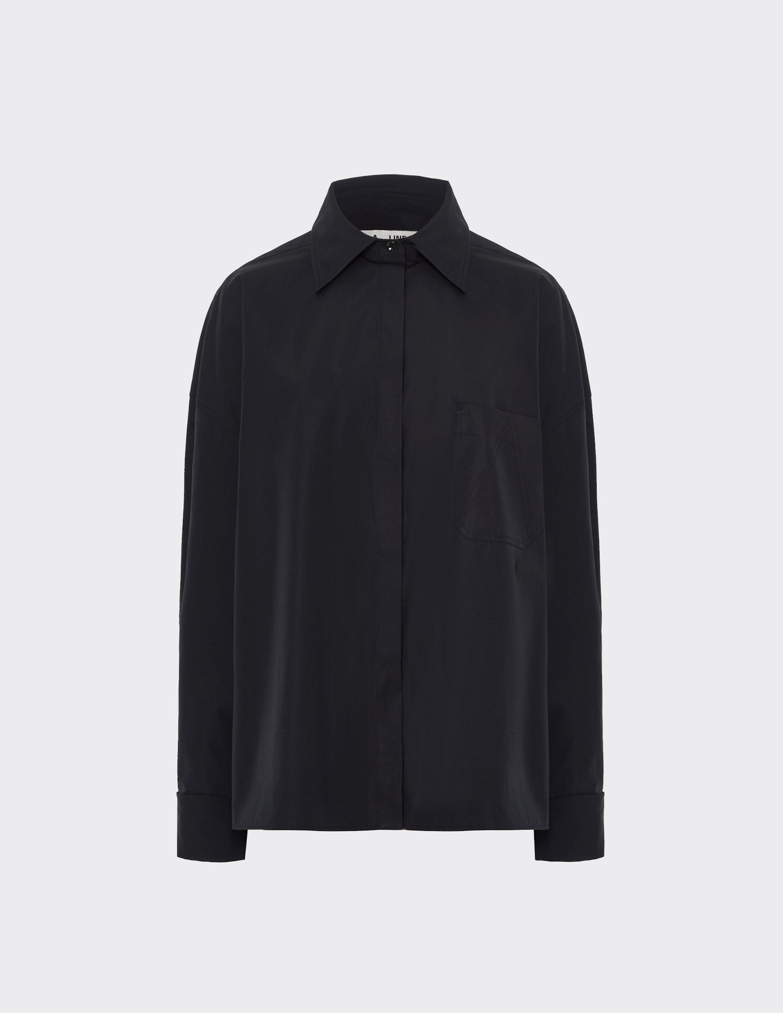 Relaxed fit shirt with pointed collar and hidden button front fastening. Chest patch pocket with stitching a-design detail. Dropped shoulder. Back yoke with box pleat deatil and loops on the back of the collar as the A-design. Straight bottom hem.