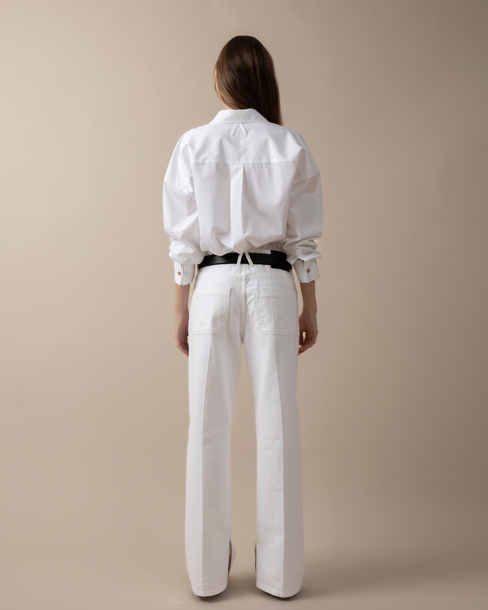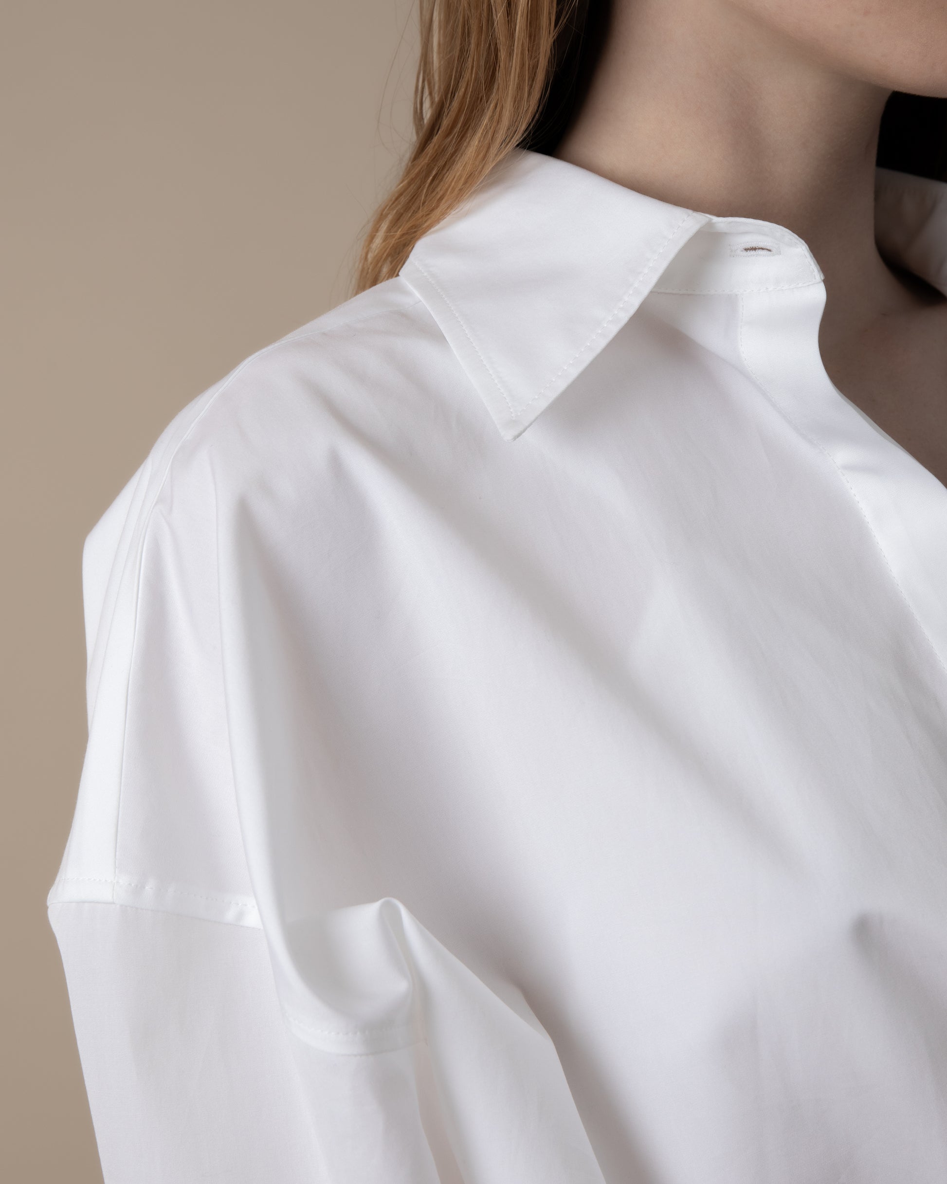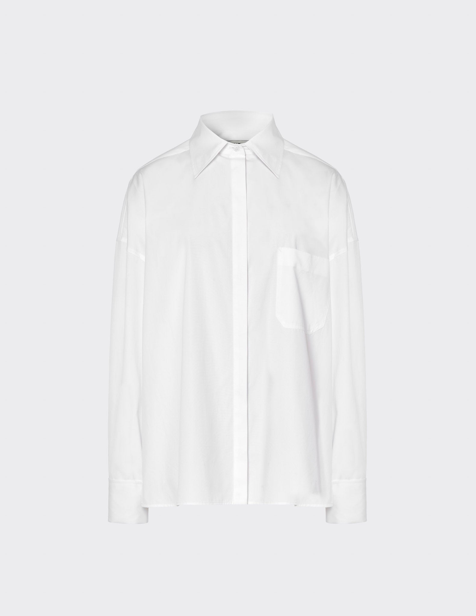 Relaxed fit shirt with pointed collar and hidden button front fastening. Chest patch pocket with stitching a-design detail. Dropped shoulder. Back yoke with box pleat deatil and loops on the back of the collar as the A-design. Straight bottom hem.