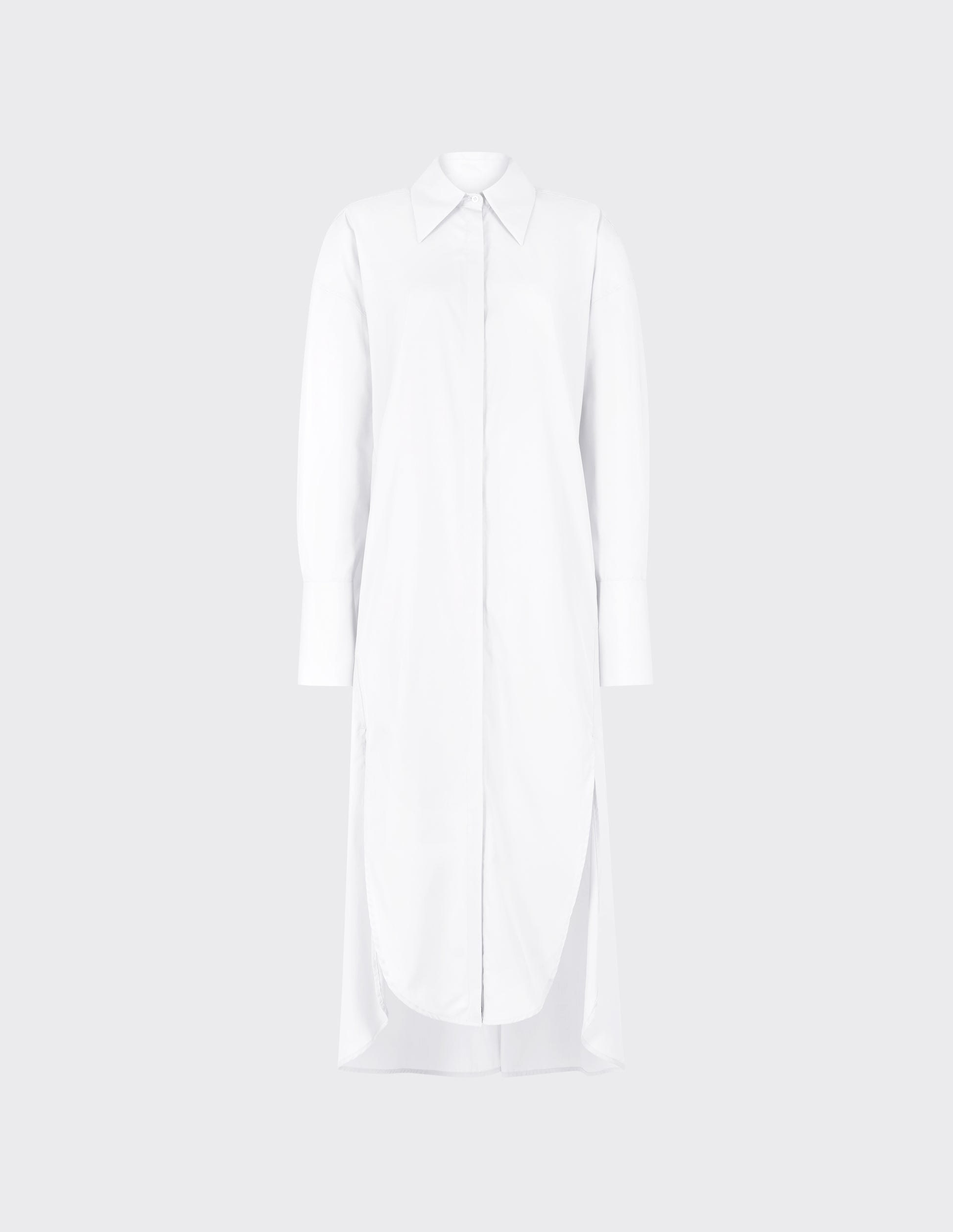 High-low midi length, concealed button-down shirtdress with front slits. High cuff with cufflink. "A" loop detail on the yoke and box pleat at the back.