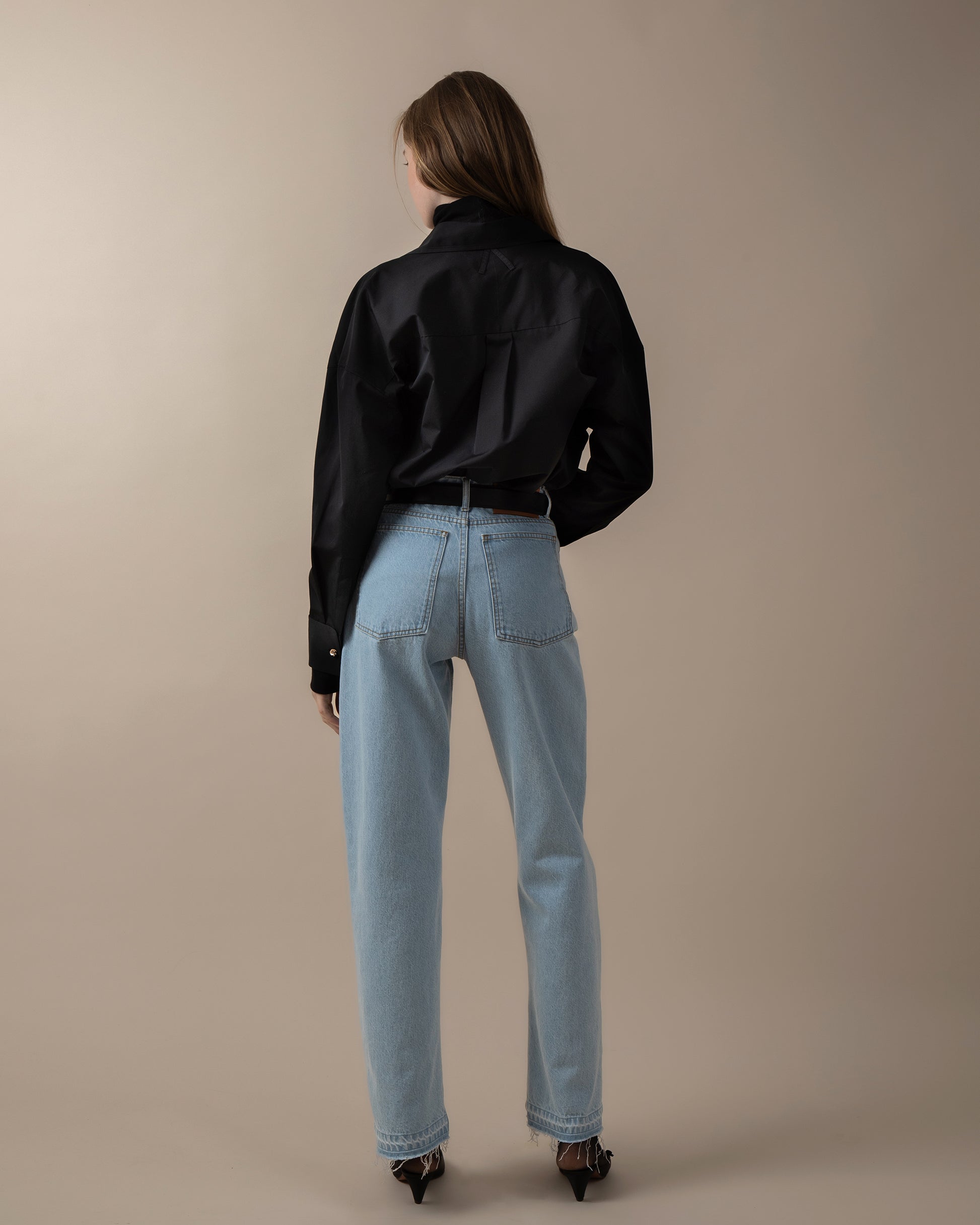 Mid-rise straight-leg organic cotton jeans with contrast stitching. Dropped flare waist-style, regular fit with 4 pocket and 1 coin pocket. Light wash denim. Single button waistband front fastening and zipper. Interior front pocket lining with contrasting cotton fabric. Bottom hem-detailing.