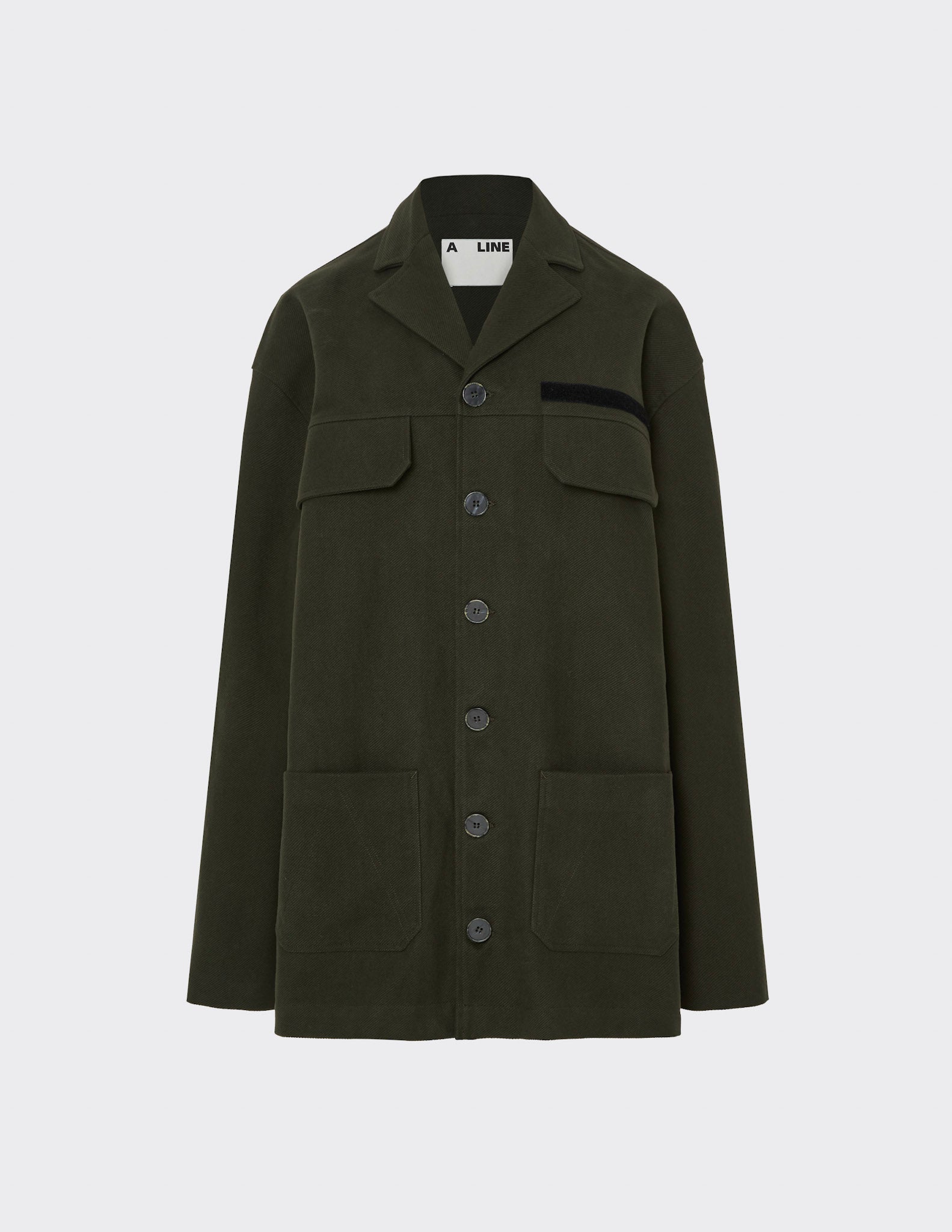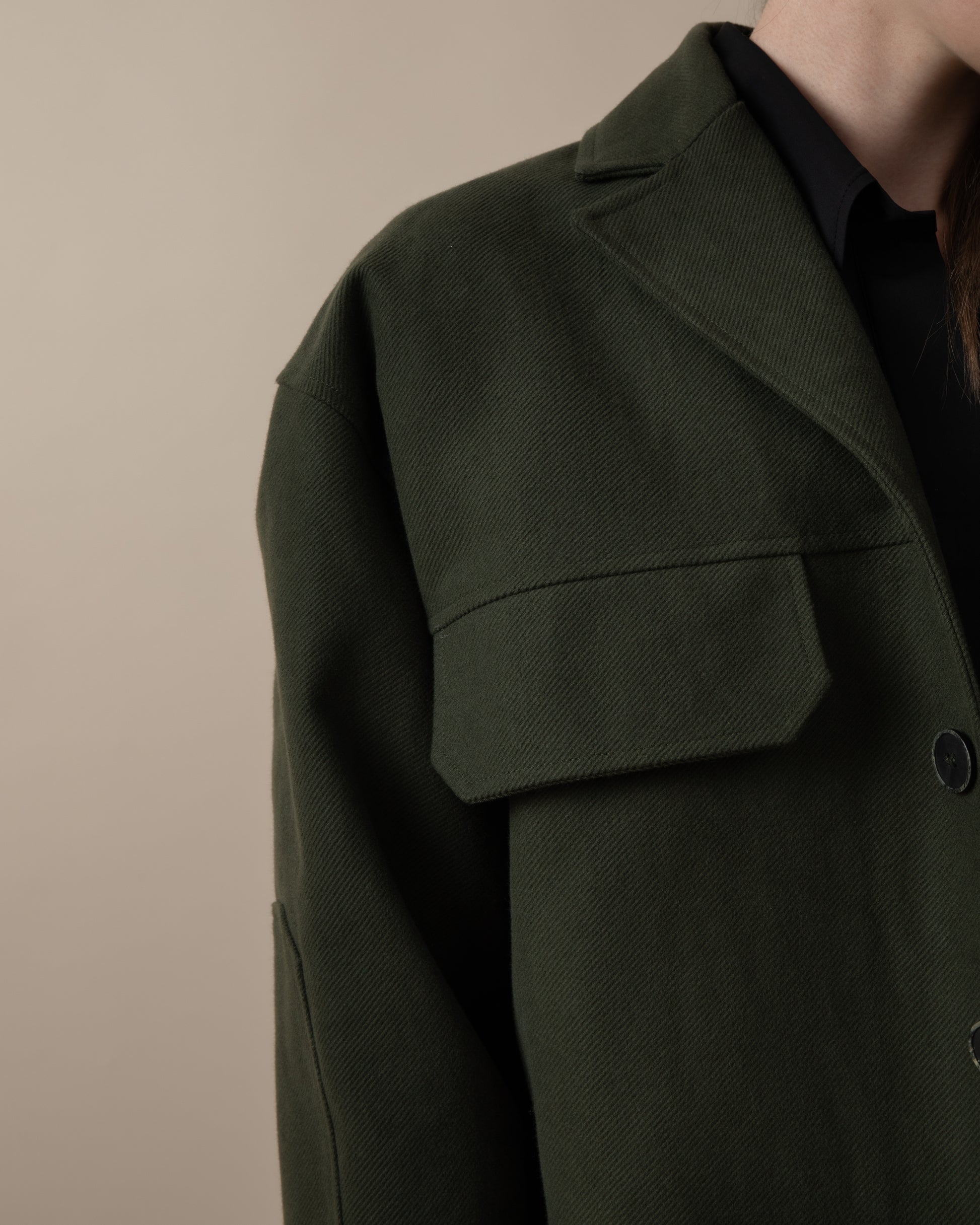 Relaxed fit utility jacket with boxy silhouette. Peaked lapels, 2 patch pocket with flap and 2 patch pockets on the front with double stitching detail in A design. Long-sleeve with elbow pads. Raglan sleeves. Back yoke with box pleat and belt lops as the A-detail on the back of the collar. Straight bottom hem. Lined.