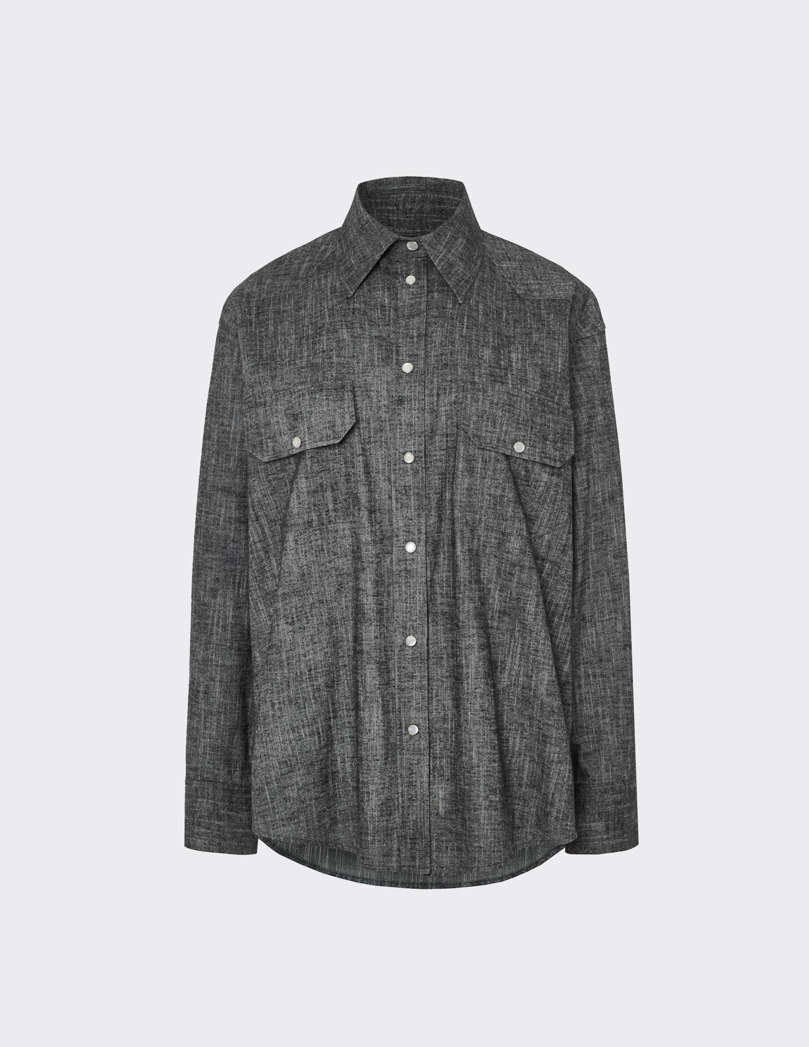 Relaxed fit shirt with pointed collar and buttoned front fastening. Western front and back yokes and dropped shoulder. Two patch pockets with flap and snap button, stitching A-design detailing. Round bottom hem.